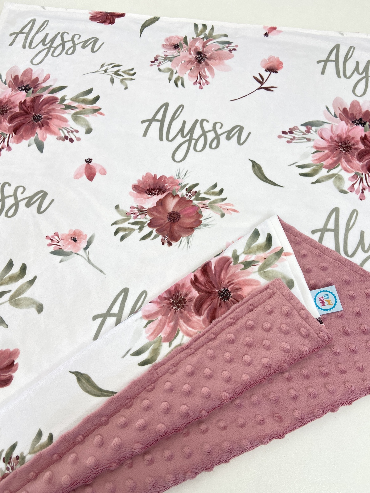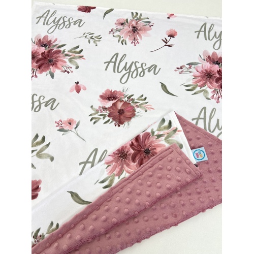 Custom made blankets are carefully constructed with 2 layers of plush minky material which makes them nice and warm. The front side it is printed and personalised with your chosen name and the reverse side is a coordinating solid colour, in either smooth or bubble dot minky.