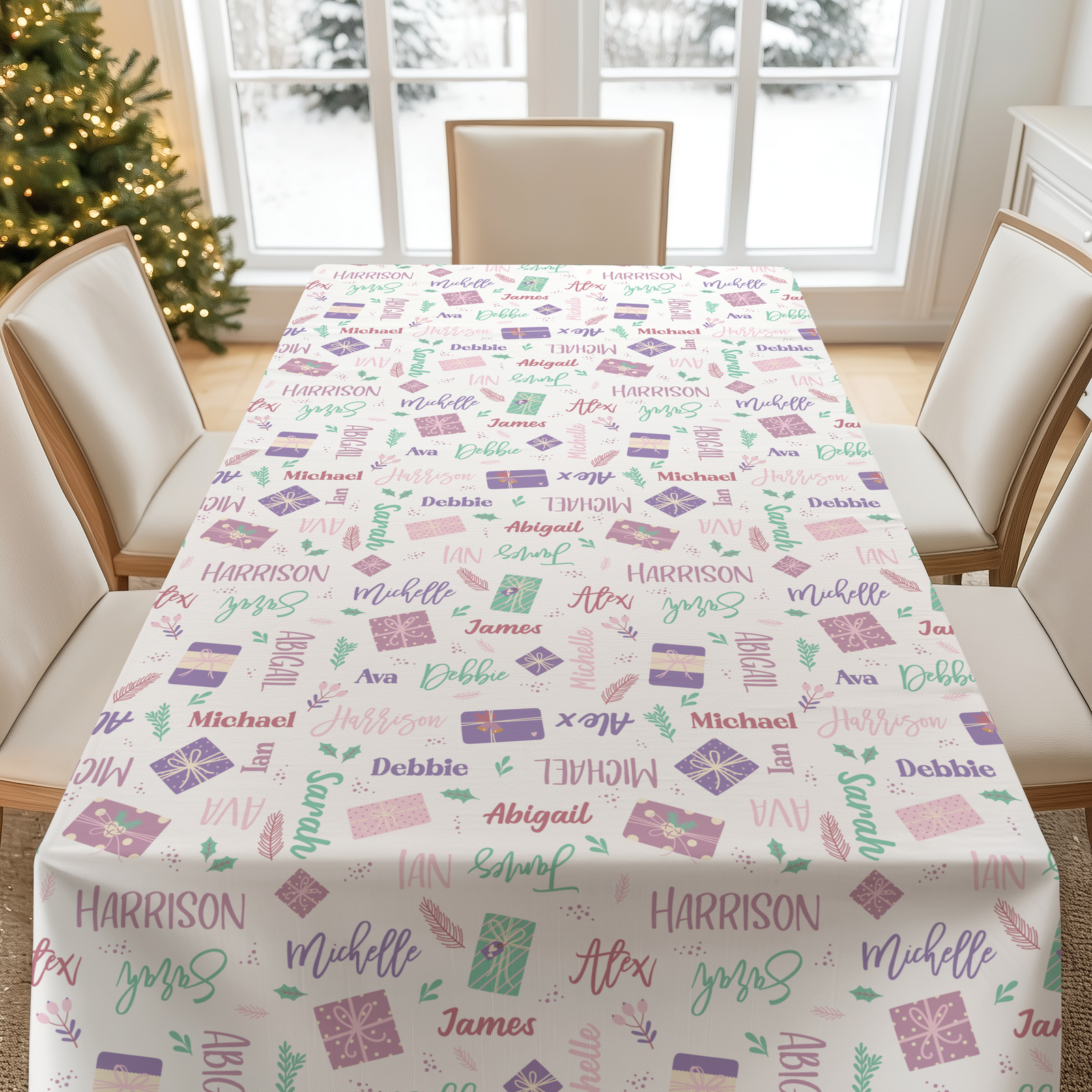 Custom made with your family's names, these one of a kind tablecloth's will be a stylish addition to your family dinner table.