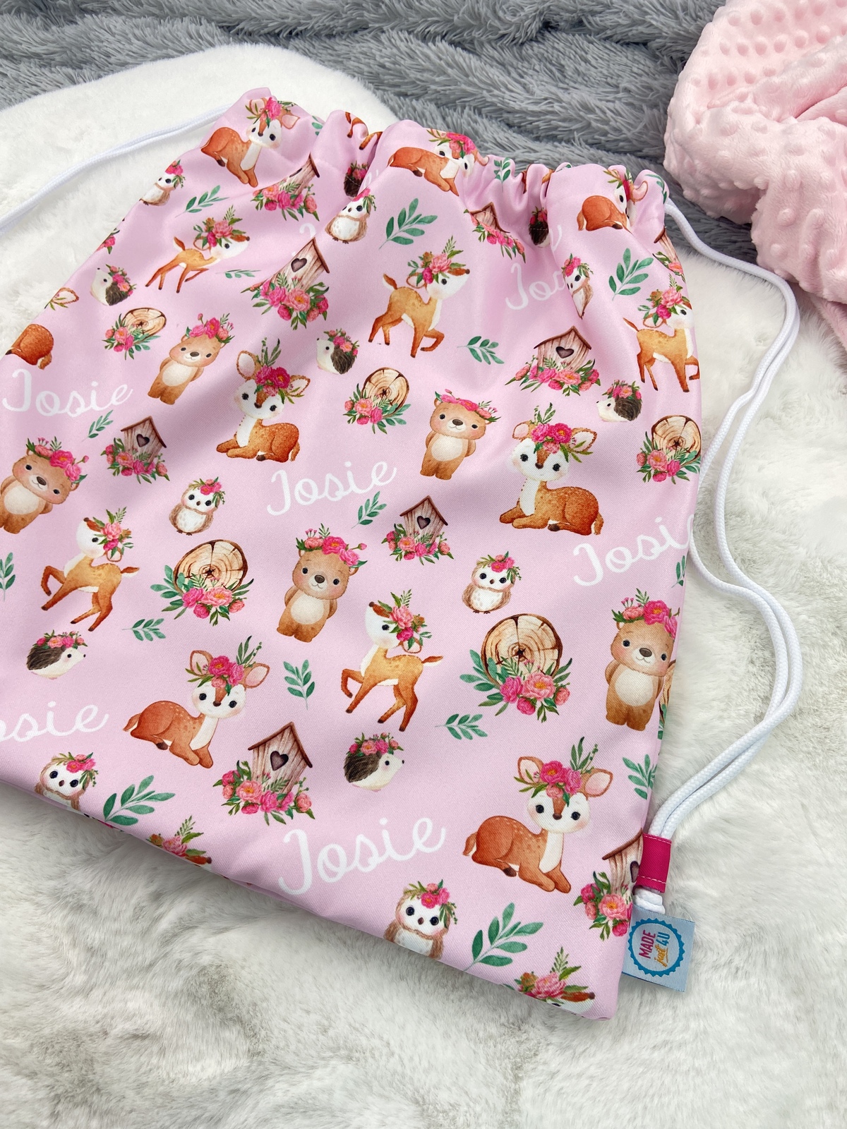 Fabric is printed and then cut and sewn into the bags for a flawless edge to edge finish right here in our Brisbane home studio. All bags are personalised with your chosen name. First name or First and Last name work best in this design. Long names will change the placement of the pattern. We can also have a first name repeating over the bag with their full name in bold at the top/bottom of the bag if you wish, please send us an email.