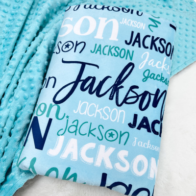 Custom made blankets are carefully constructed with 2 layers of plush minky material which makes them nice and warm. The front side it is printed and personalised with your chosen name and the reverse side is a coordinating solid colour, in either smooth or bubble dot minky.