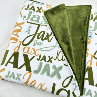 Custom made blankets are carefully constructed with 2 layers of plush minky material which makes them nice and warm. The front side it is printed and personalised with your chosen name and the reverse side is a coordinating solid colour, in either smooth or bubble dot minky.