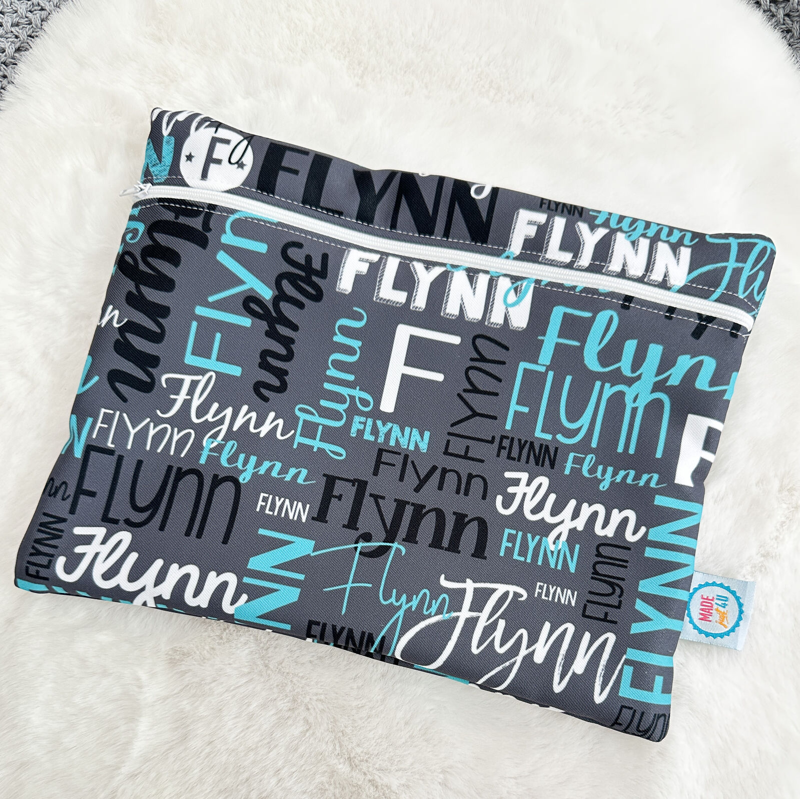 Fabric is printed and then cut and sewn into the wet bag case for a flawless edge to edge finish in my Brisbane studio. All wet bags are personalised with your chosen name. First name or First and Last name work best in this design. Long names will change the placement of the pattern.